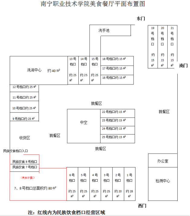 本项目档口位于南宁职业技术学院美食餐厅内,面积约8-80㎡不等(详见附件1)。